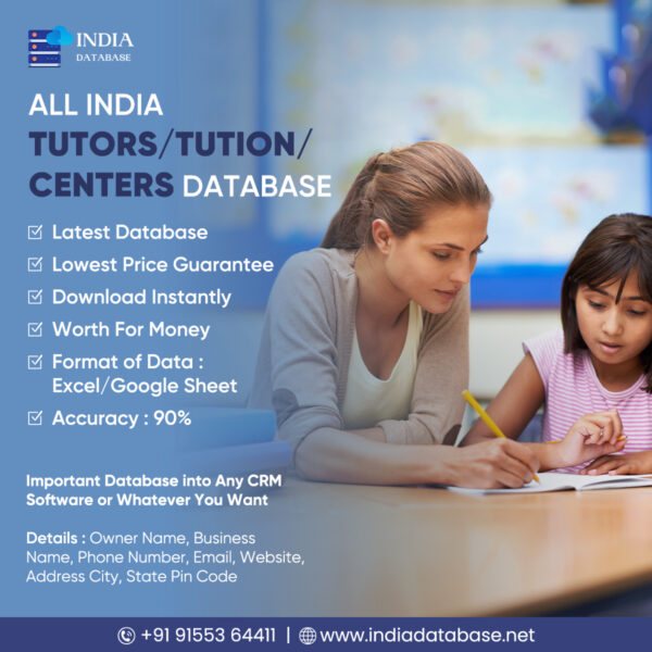The All India Tutors/Tuition Centers Database is a comprehensive and meticulously curated collection of 55,000 verified records of tutors, tuition centers, and coaching classes across India. This resource is designed to cater to the needs of educational institutions, tutoring companies, parents, and students looking for qualified tutors and coaching centers in their vicinity. Whether you need contacts for local tutoring services, online tutoring platforms, or private tutors, this database has it all.